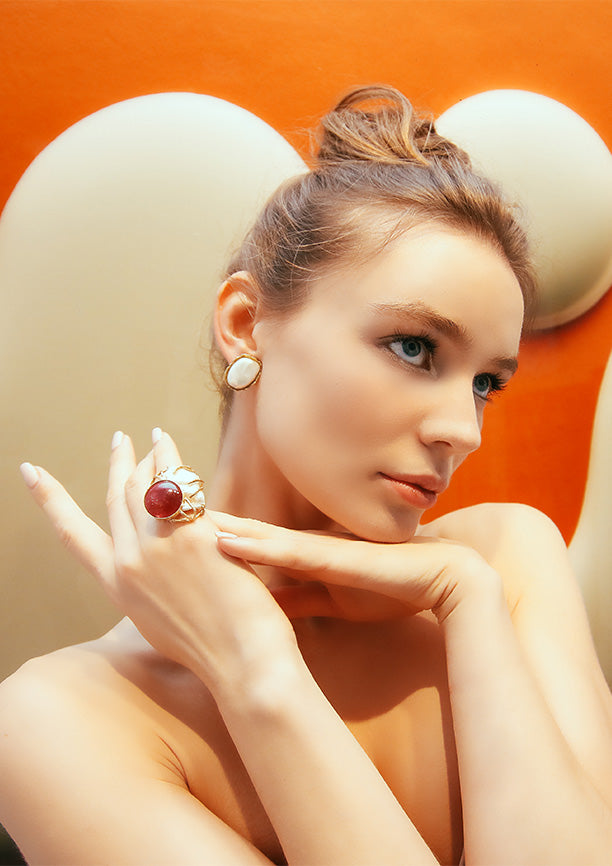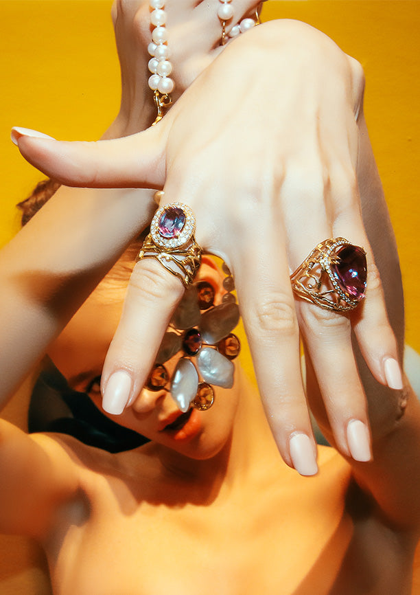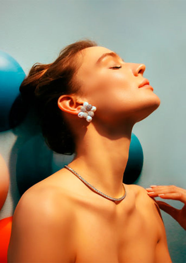The diverse forms and vibrant colours, against two-dimensional paintings, developed a dynamic energy and a sense of fluidity into each image. The jewellery pieces, with their distinct presence, create a striking contrast against the purity of the model. This interplay challenges the spectator to explore the jewellery's detail. Maria João Bahia's Gallery collection, where every piece is a work of art in motion.